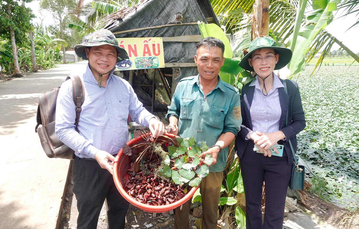 Anh Lương Văn Đấu giới thiệu sản phẩm ấu với Bí thư Đảng ủy xã Hòa Thuận Trần Văn Thanh. Ảnh: BÍCH THÙY