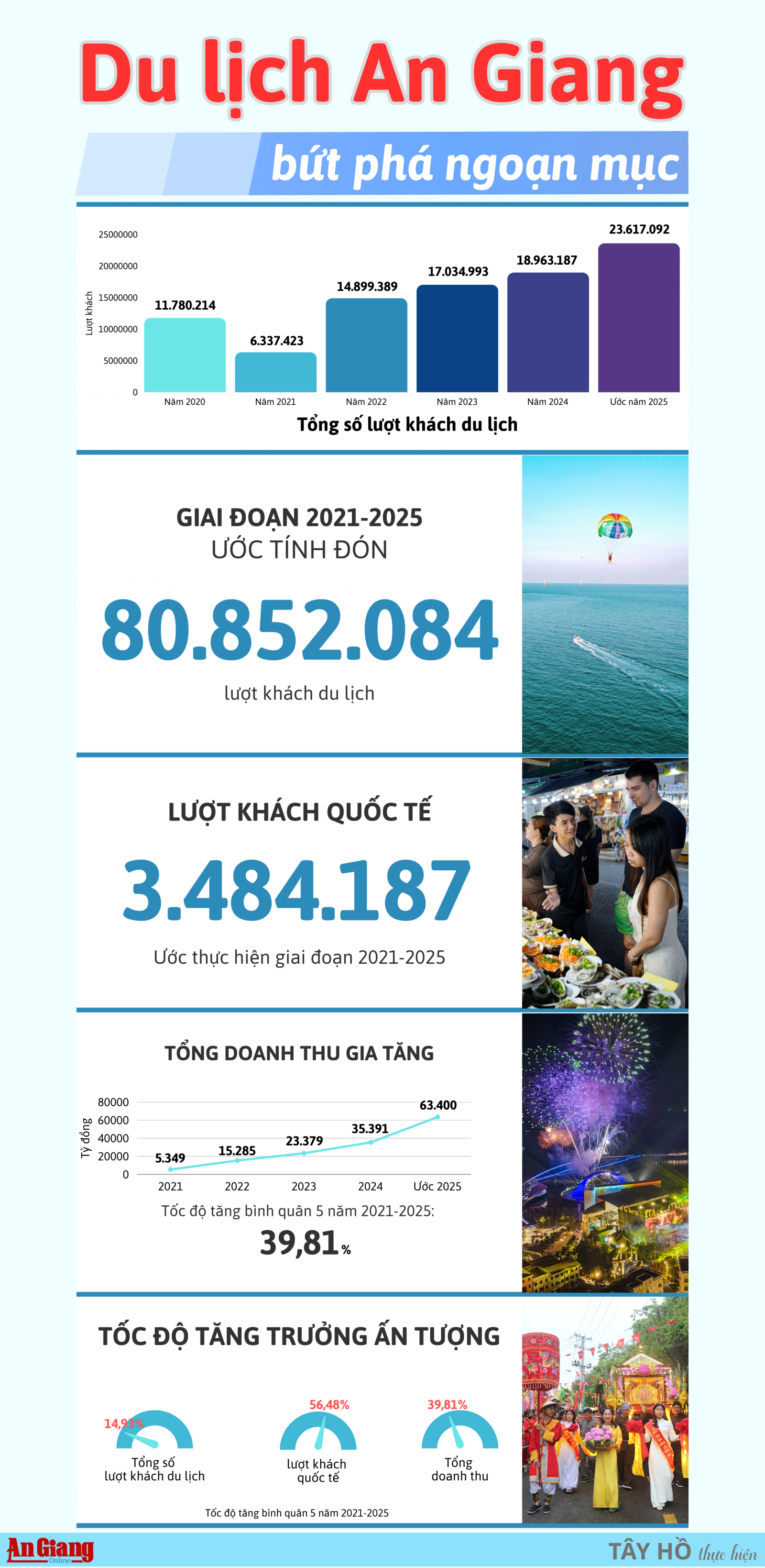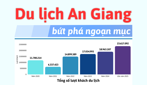- Du lịch An Giang giai đoạn 2021 - 2025 ghi nhận sự bứt phá ngoạn mục với hơn 80,8 triệu lượt khách, vượt chỉ tiêu kế hoạch và khẳng định sức hút điểm đến du lịch. Lượng khách quốc tế tăng nhanh, đạt trên 3,4 triệu lượt. Doanh thu du lịch hơn 142.800 tỷ đồng, tốc độ tăng bình quân gần 40%/năm - trở thành một trong những động lực mới cho tăng trưởng kinh tế - xã hội của tỉnh.
