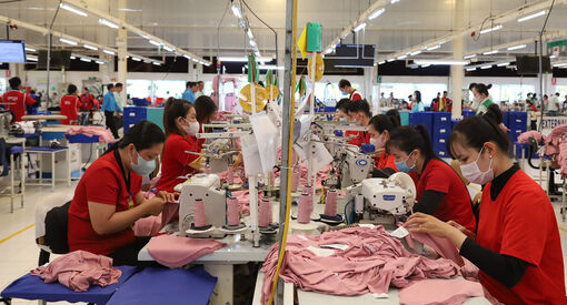 Công nhân Công ty Trách nhiệm hữu hạn NV Apparel trong giờ làm việc. Ảnh: BẢO HÂN