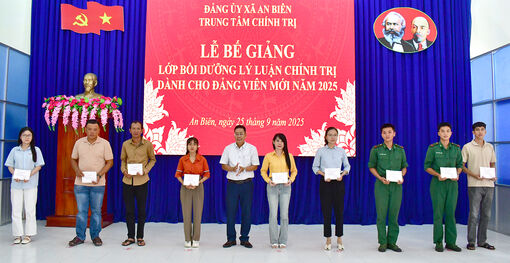 Chiều 25/9, Trung tâm Chính trị xã An Biên (tỉnh An Giang) tổ chức bế giảng lớp bồi dưỡng lý luận chính trị dành cho đảng viên mới năm 2025. Tham gia lớp học có 35 học viên từ các chi bộ, đảng bộ xã An Biên, Đông Thái, Tây Yên và các đơn vị lực lượng vũ trang đóng quân trên địa bàn.