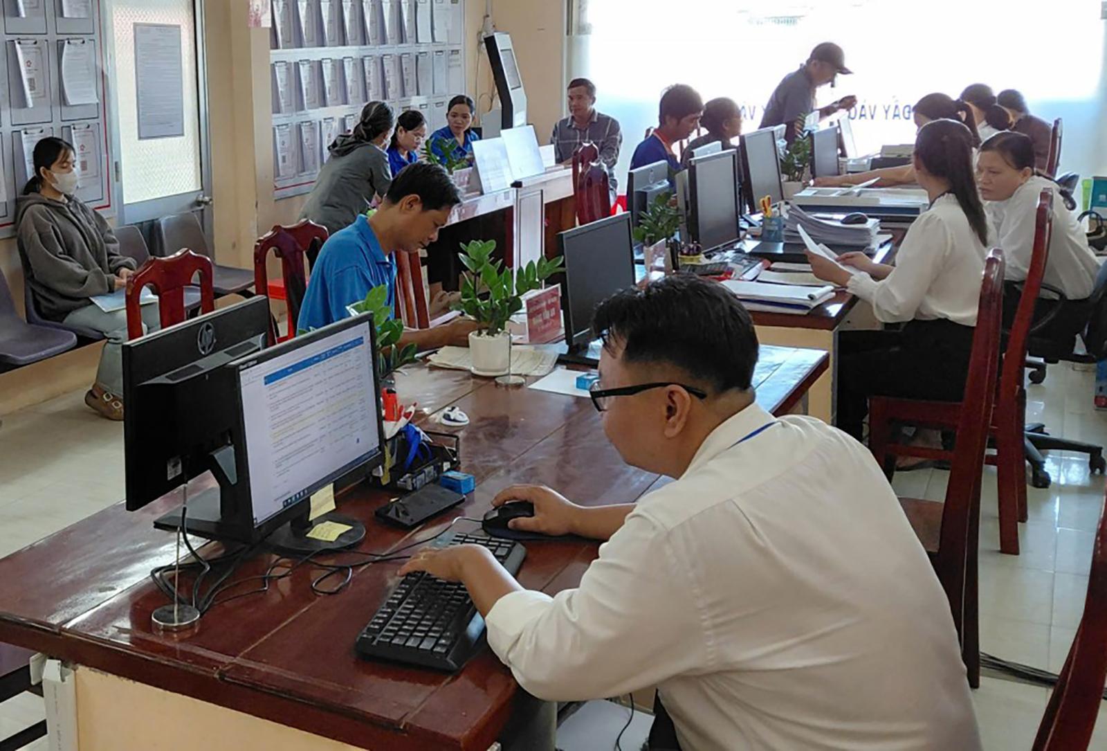Cán bộ Trung tâm Phục vụ hành chính công xã Long Kiến (tỉnh An Giang) thực hiện thủ tục hành chính cho người dân.