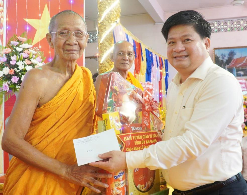 Ủy viên Ban Thường vụ Tỉnh ủy, Trưởng Ban Tuyên giáo và Dân vận Tỉnh ủy An Giang Tống Phước Trường tặng quà Hòa thượng Chau Ty, Phó Pháp chủ Hội đồng Chứng minh Giáo hội Phật giáo Việt Nam.