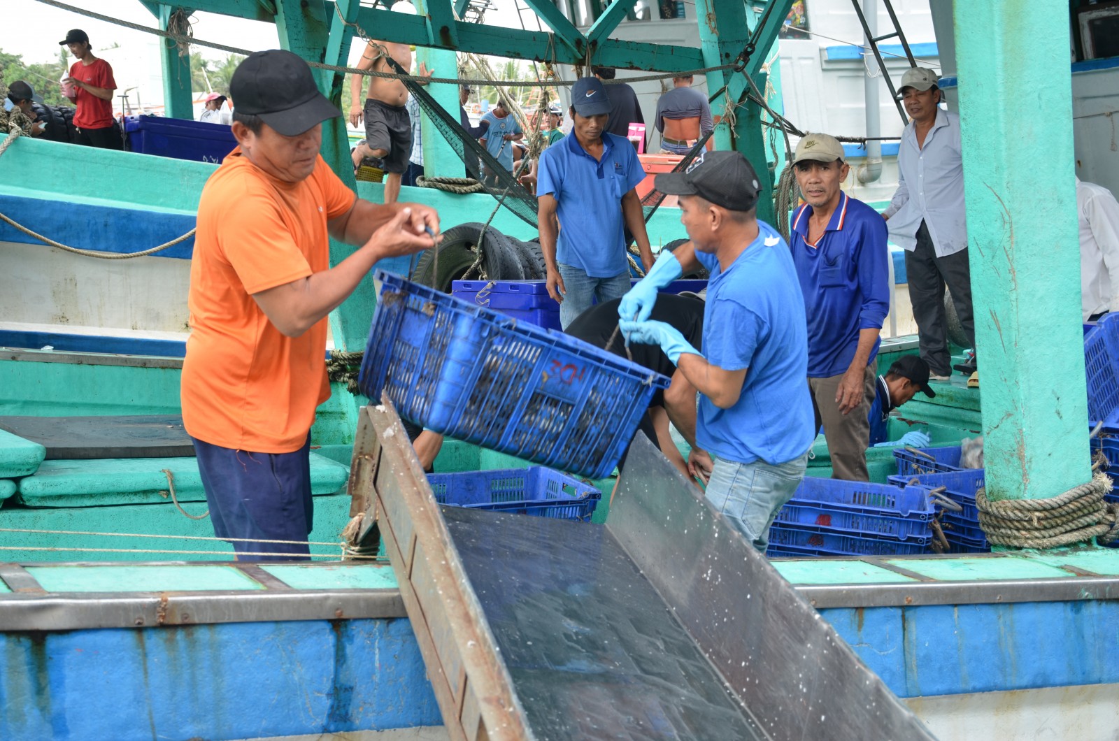 Công nhân bốc dỡ thủy sản tại Cảng cá Tắc Cậu.