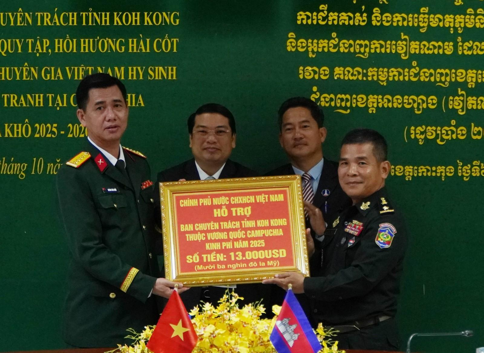 Dịp này, Ban Chuyên trách tỉnh An Giang được ủy quyền của Ban Chuyên trách Chính phủ Việt Nam trao kinh phí hỗ trợ Ban Chuyên trách tỉnh Koh Kong trong phối hợp tổ chức các hoạt động giúp Đội K92 tìm kiếm, quy tập hài cốt liệt sĩ quân tình nguyện và chuyên gia Việt Nam hy sinh trong các thời kỳ chiến tranh tại Campuchia trên địa bàn tỉnh Koh Kong mùa khô 2025 - 2026.