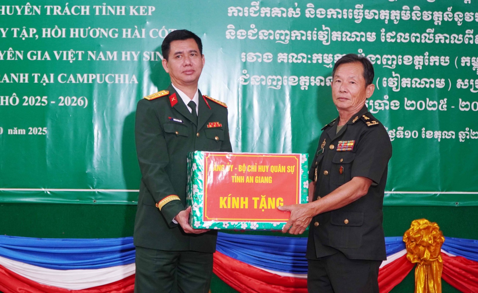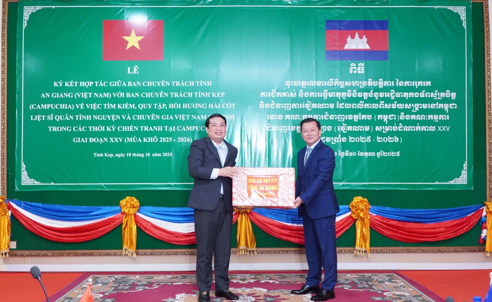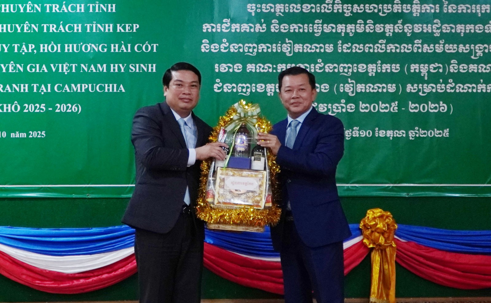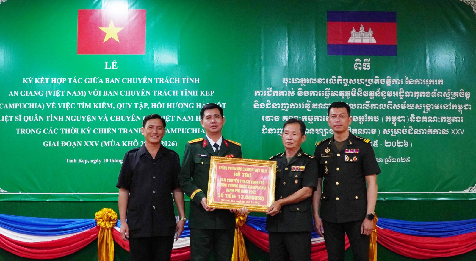 Dịp này, Ban Chuyên trách tỉnh An Giang được ủy quyền của Ban Chuyên trách Chính phủ Việt Nam trao kinh phí hỗ trợ Ban Chuyên trách tỉnh Kep trong phối hợp tổ chức các hoạt động giúp Đội K92 tìm kiếm, quy tập hài cốt liệt sĩ quân tình nguyện và chuyên gia Việt Nam hy sinh trong các thời kỳ chiến tranh tại Campuchia trên địa bàn tỉnh mùa khô 2025 - 2026.