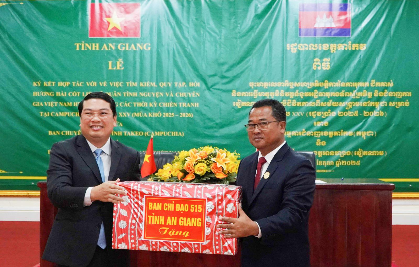 Phát biểu tại buổi lễ, ngài Sut Khon - Phó Tỉnh trưởng, Trưởng Ban Chuyên trách tỉnh Takeo vui mừng chào đón đoàn đại biểu tỉnh An Giang đến tổ chức lễ ký kết. Đồng thời đánh giá cao thời gian qua hai tỉnh Takeo - An Giang đã hợp tác tìm kiếm, quy tập, hồi hương hài cốt liệt sĩ quân tình nguyện và chuyên gia Việt Nam hy sinh trong các thời kỳ chiến tranh tại Campuchia trên địa bàn tỉnh Takeo đạt nhiều kết quả.