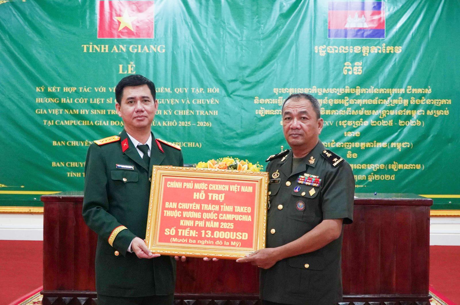 Được ủy quyền của Ban Chuyên trách Chính phủ Việt Nam, Chính ủy Bộ Chỉ huy Quân sự tỉnh An Giang trao kinh phí hỗ trợ Ban Chuyên trách tỉnh Takeo.