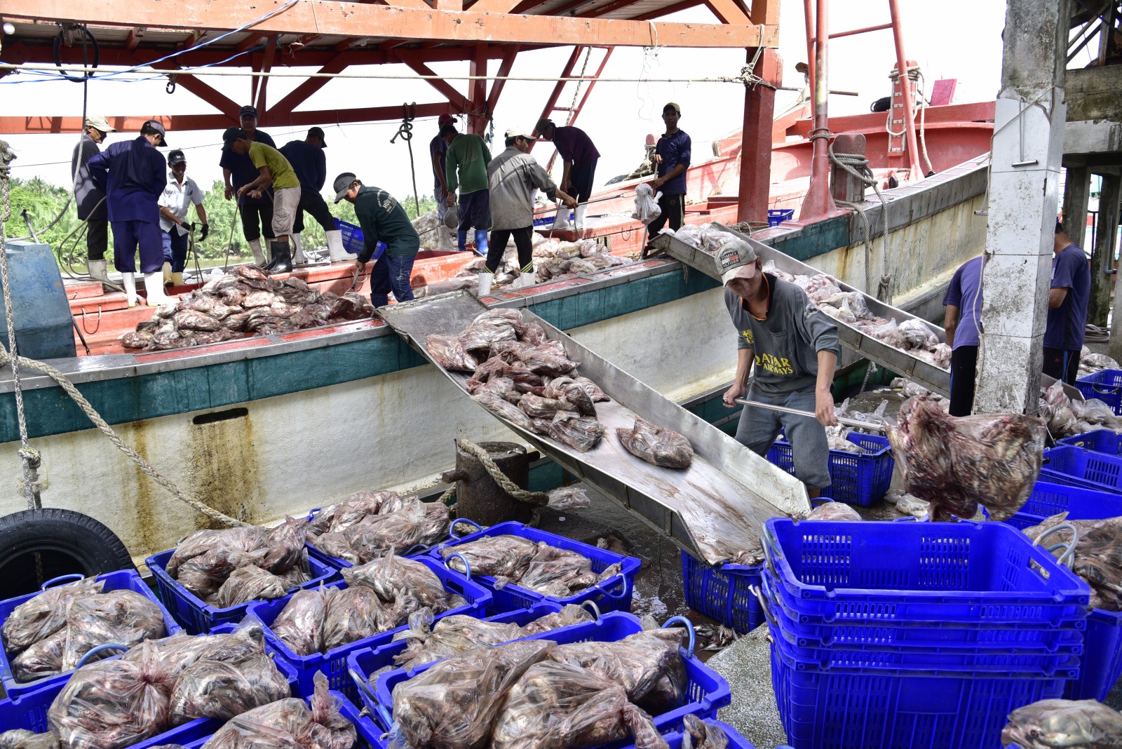 Ngư dân tập kết hải sản lên Cảng cá Tắc Cậu, xã Bình An đưa đi tiêu thụ.