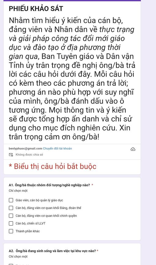 Cuộc khảo sát nhằm thu thập ý kiến từ các nhóm: phụ huynh, học sinh, cán bộ quản lý giáo dục, giáo viên, công chức, viên chức và người dân để: Đánh giá kết quả đổi mới giáo dục tại An Giang; xác định tình trạng thừa/thiếu giáo viên cục bộ; tìm hiểu khó khăn, hạn chế và nguyên nhân trong công tác đổi mới giáo dục; đánh giá việc triển khai chương trình, sách giáo khoa mới; ghi nhận phản hồi về tác động của mô hình chính quyền địa phương 2 cấp; đề xuất giải pháp nâng cao chất lượng giáo dục, phát triển giáo dục nghề nghiệp gắn với thế mạnh địa phương và cải thiện nguồn nhân lực. Kết quả khảo sát sẽ là cơ sở để đề xuất các giải pháp hiệu quả, nâng cao chất lượng giáo dục và đào tạo trên địa bàn tỉnh. Thời gian thực hiện cuộc khảo sat từ quý III/2025. Giai đoạn lấy ý kiến trực tuyến: 6/9 – 10/9/2025.