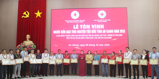 Sáng 6/10, Ban Chỉ đạo Vận động hiến máu tình nguyện tỉnh An Giang tổ chức lễ tôn vinh những người hiến máu tiêu biểu năm 2025. Phó Chủ tịch UBND tỉnh An Giang Nguyễn Thị Minh Thúy đến dự.