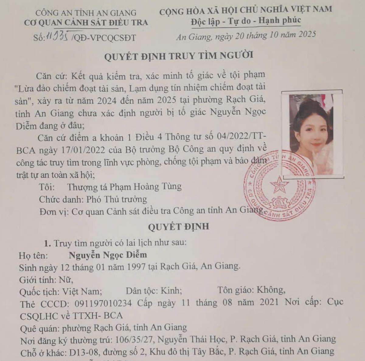 Ngày 21/10, Cơ quan Cảnh sát điều tra Công an tỉnh An Giang cho biết vừa ra quyết định truy tìm đối tượng Nguyễn Ngọc Diễm, sinh năm 1997, cư trú đường Nguyễn Thái Học, phường Rạch Giá (tỉnh An Giang) để phục vụ công tác điều tra vụ lừa đảo chiếm đoạt tài sản, lạm dụng tín nhiệm chiếm đoạt tài sản” xảy ra tại phường Rạch Giá.