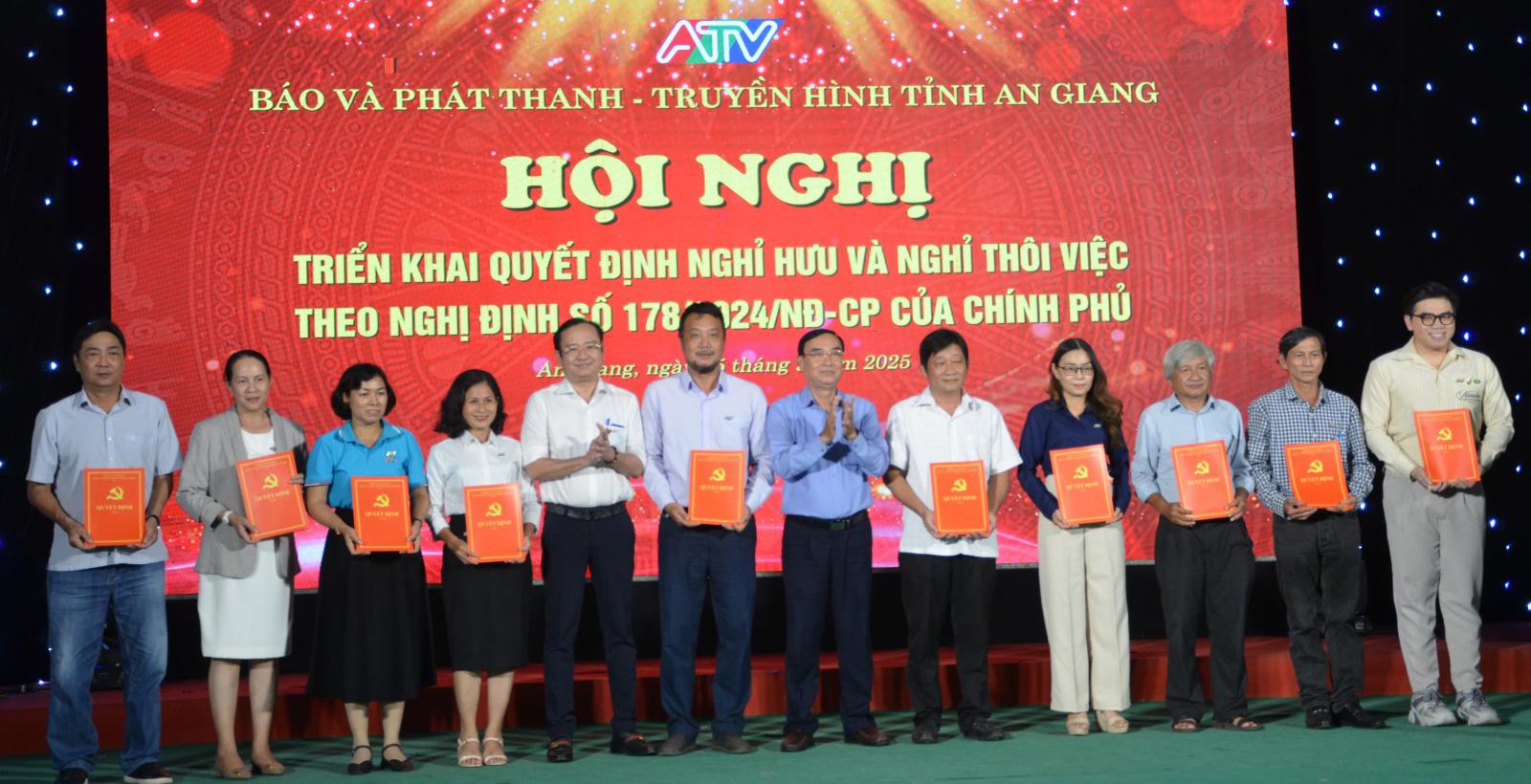 Tại hội nghị, đại diện Phòng Tổ chức - Hành chính và Dịch vụ công bố các quyết định của Ban Biên tập Báo và Phát thanh - Truyền hình tỉnh An Giang về việc nghỉ hưu, nghỉ công tác theo Nghị định 178 và Nghị định 67 của Chính phủ đối với 64 cán bộ, viên chức, người lao động; 5 viên chức nghỉ thôi việc theo nguyện vọng cá nhân.