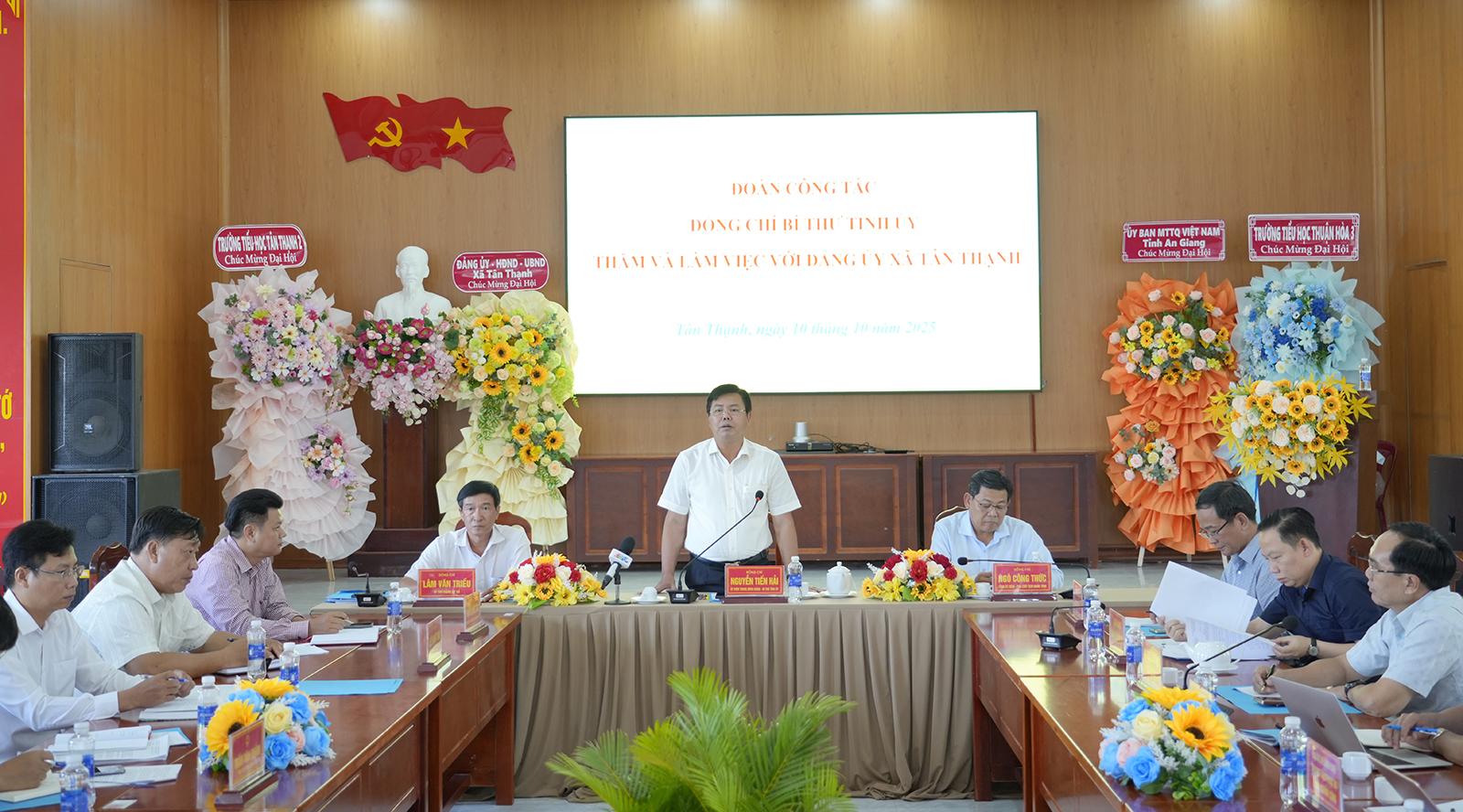 Ủy viên Ban Chấp hành Trung ương Đảng, Bí thư Tỉnh ủy An Giang Nguyễn Tiến Hải phát biểu chỉ đạo tại buổi làm việc với Đảng ủy xã Tân Thạnh.