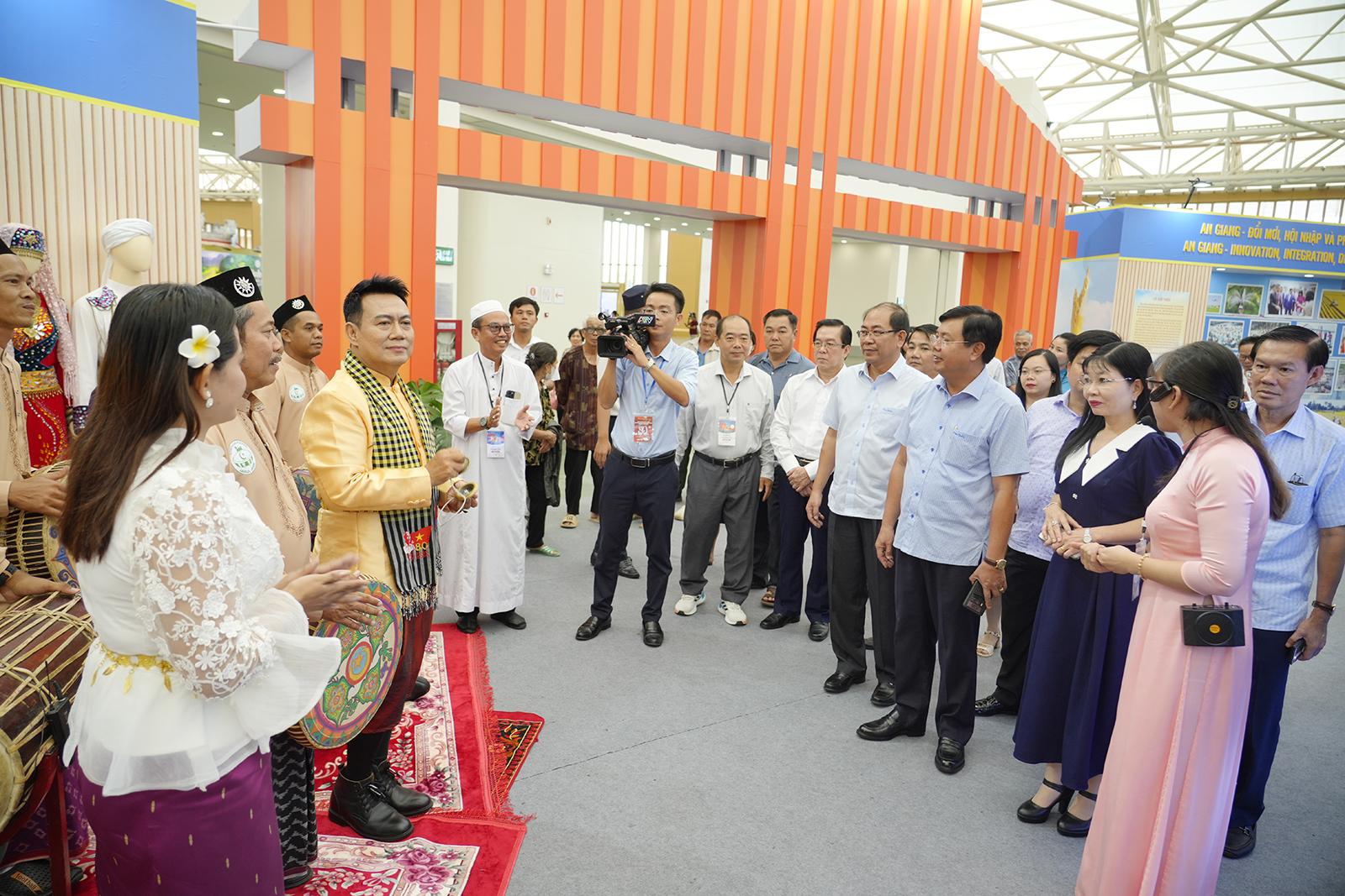 Bí thư Tỉnh ủy An Giang Nguyễn Tiến Hải, cùng đoàn công tác tìm hiểu không gian trưng bày văn hóa Chăm, Khmer tại gian hàng của tỉnh An Giang trong Triển lãm thành tựu đất nước vào sáng 4/9.