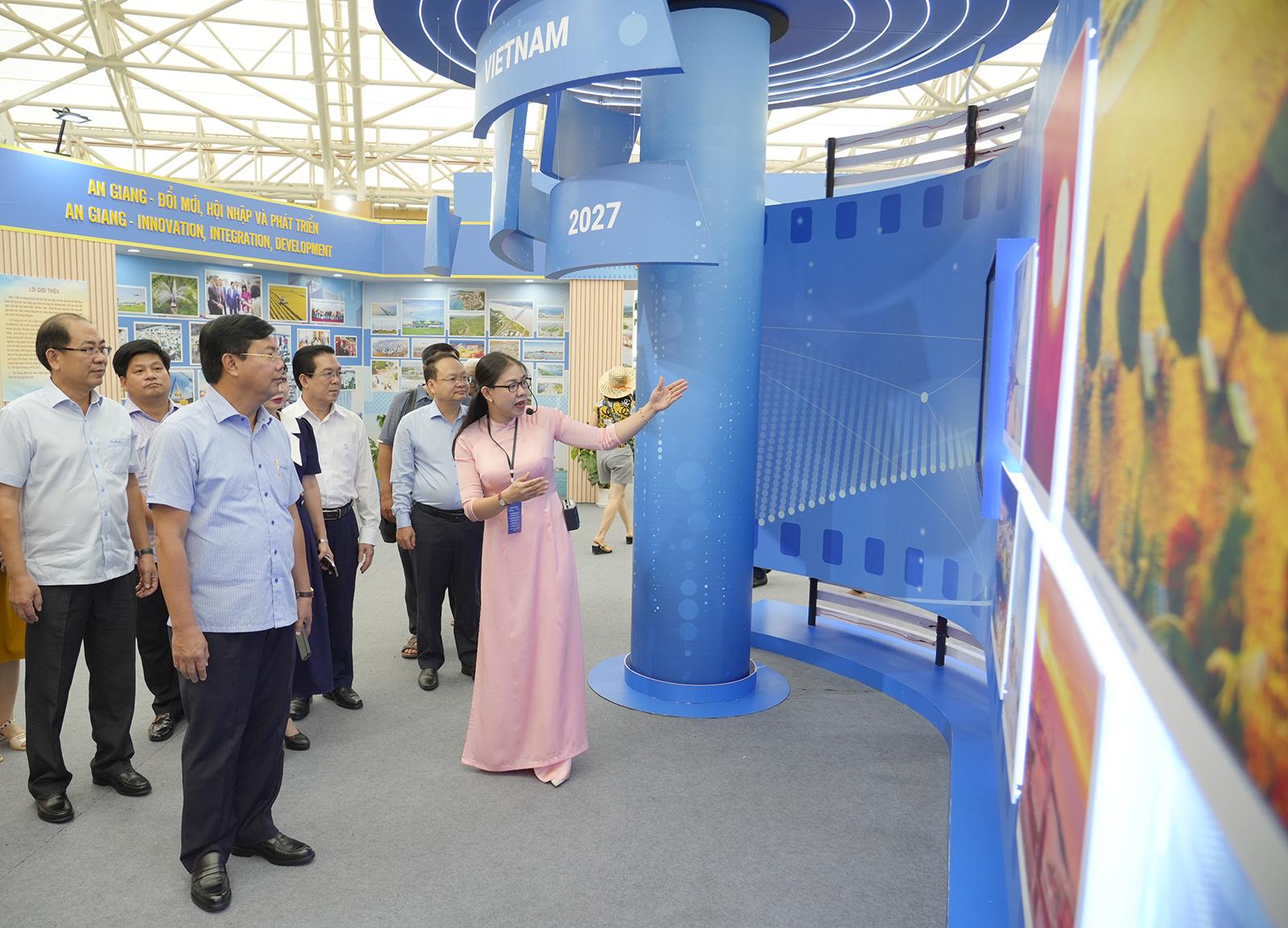 Bí thư Tỉnh ủy An Giang Nguyễn Tiến Hải cùng đoàn công tác tham quan không gian trưng bày điểm nhấn APEC 2027 tại gian hàng của tỉnh An Giang trong Triển lãm thành tựu đất nước vào sáng 4/9.