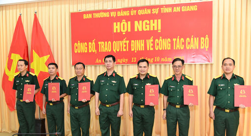 Cụ thể, công bố và trao quyết định cho 16 đồng chí thuộc Bộ Chỉ huy Quân sự tỉnh An Giang, trong đó trao quyết định nghỉ việc hưởng chế độ bảo hiểm xã hội cho 3 đồng chí; trao quyết định nghỉ chờ hưu cho 1 đồng chí và trao quyết định điều động, bổ nhiệm chức vụ cán bộ cho 12 đồng chí.