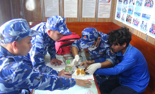 Cán bộ, chiến sĩ Tàu CSB 4035 hỗ trợ y tế cho nạn nhân gặp nạn trên biển.