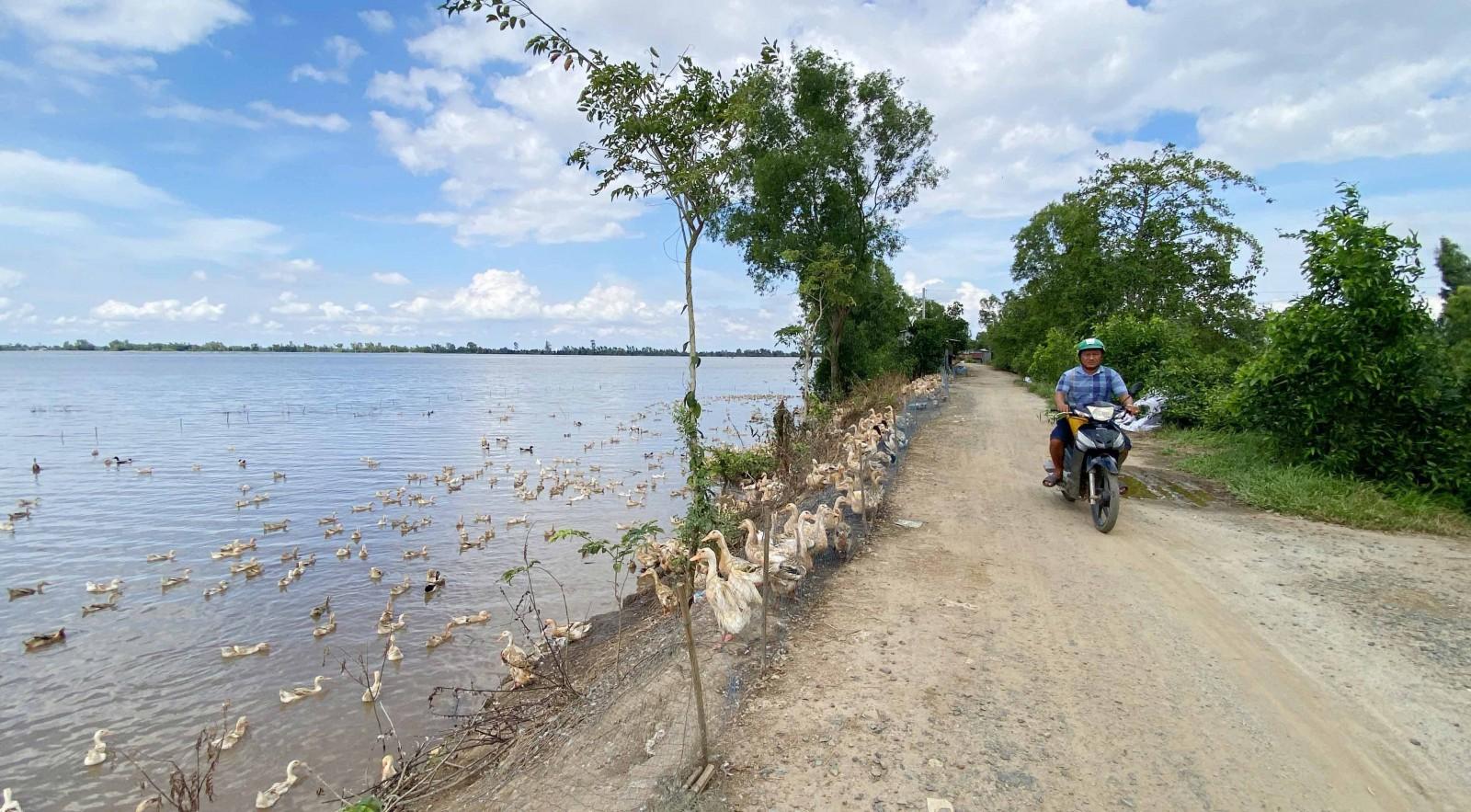 Đàn vịt trên tuyến đê trong cánh đồng tứ giác Long Xuyên. Ảnh: THÀNH CHINH