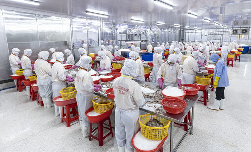 Công nhân Công ty Cổ phần Chế biến Thủy sản Xuất nhập khẩu Kiên Cường sơ chế mực tuộc xuất khẩu. Ảnh: KIỀU DIỄM