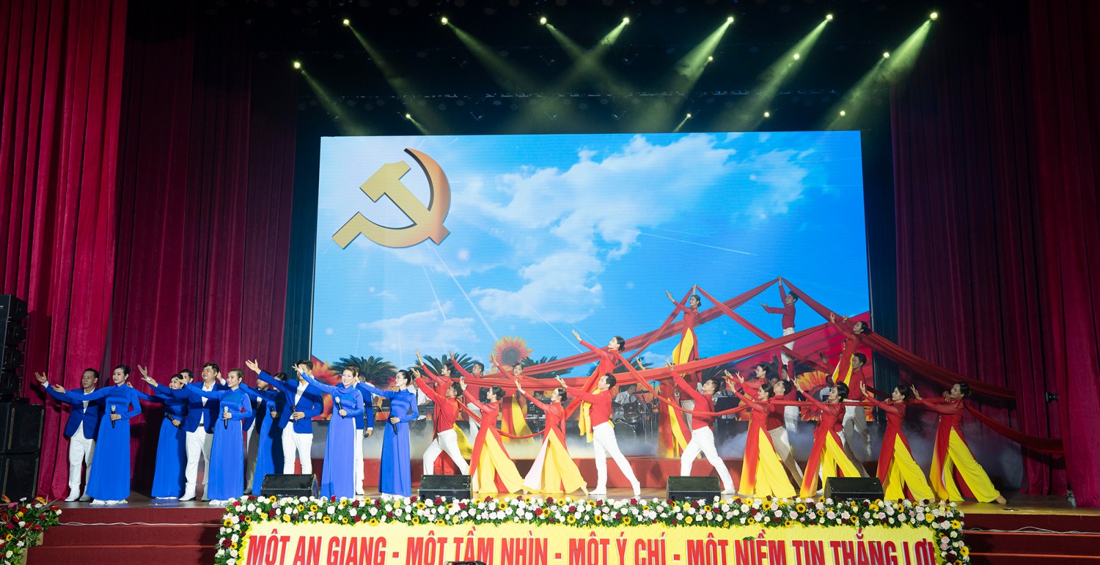 Với chủ đề “Vững bước dưới cờ Đảng”, chương trình nghệ thuật được dàn dựng công phu, có tính nghệ thuật cao, gồm các tiết mục ca múa nhạc: Tự hào Đảng quang vinh, Mùa xuân đầu tiên, Những cô gái đồng bằng sông Cửu Long; Bác Hồ một tình yêu bao la, Tuổi xuân dâng Đảng, Đất nước tình yêu, Lá đỏ, Ru em bằng tiếng sóng, Một trái tim một quê hương, Hồ trên núi, Điều giản dị, Và tôi cũng yêu em, Cung đàn mùa xuân, An Giang phát triển phồn vinh…