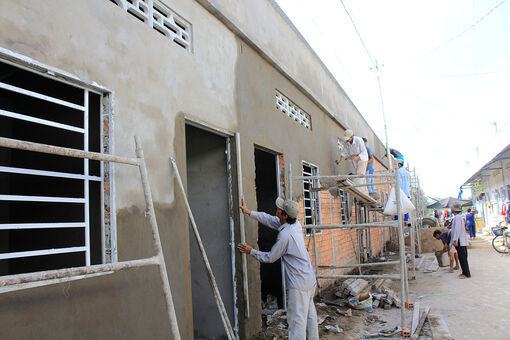 Đội thi công Ban Trị sự Giáo hội Phật giáo Hòa Hảo tham gia xây dựng các khu nhà tại phường Long Xuyên. Ảnh: GIA KHÁNH