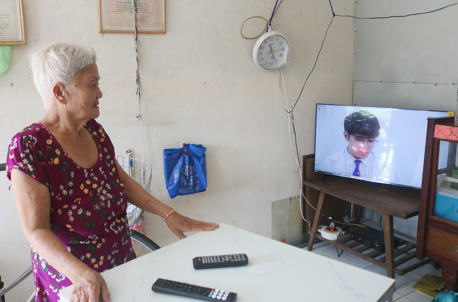 Bà Nguyễn Thị Hồng Mai vui vẻ bên chiếc tivi mới. Ảnh: GIA KHÁNH