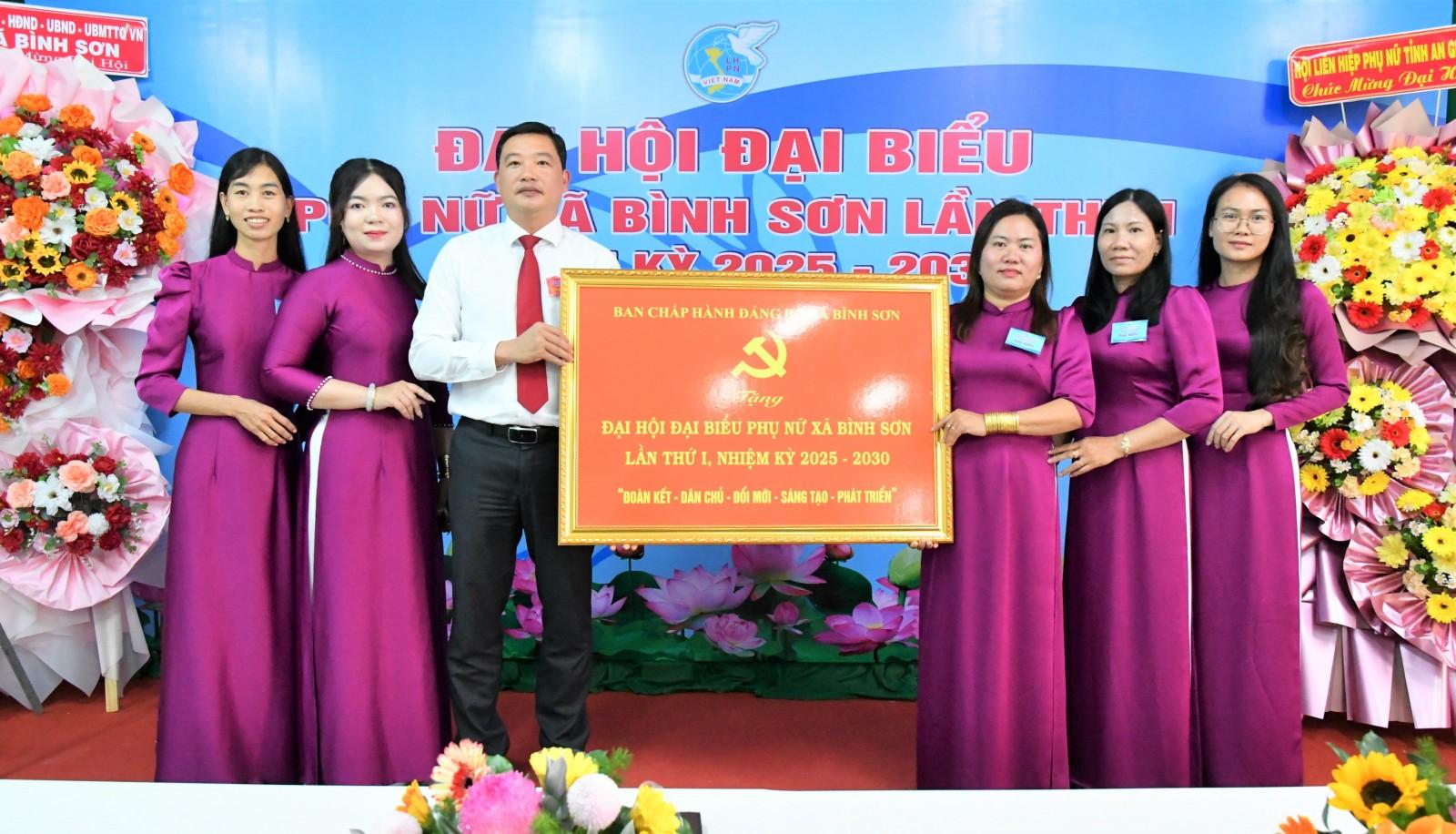 Bí thư Đảng ủy, Chủ tịch HĐND xã Bình Sơn Đỗ Hoài Thanh trao tặng bức trướng chúc mừng đại hội.