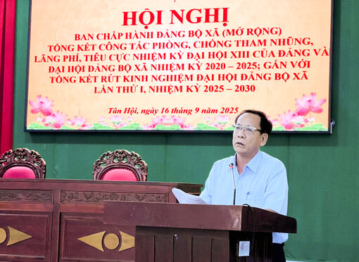 Chiều 16/9, Ban Chấp hành Đảng bộ xã Tân Hội (tỉnh An Giang) tổ chức Hội nghị tổng kết công tác phòng, chống tham nhũng, lãng phí, tiêu cực trong nhiệm kỳ Đại hội XIII của Đảng và rút kinh nghiệm công tác tổ chức Đại hội đại biểu Đảng bộ xã Tân Hội lần thứ I, nhiệm kỳ 2025 - 2030.