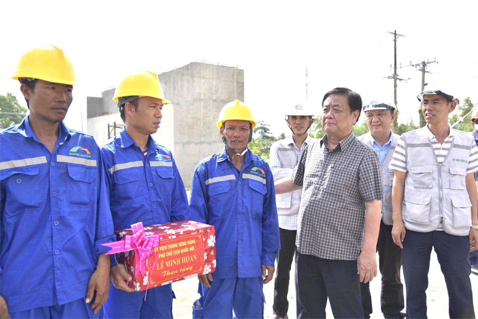 Phó Chủ tịch Quốc hội Lê Minh Hoan tặng quà động viên kỹ sư, công nhân, nhà thầu đang thi công dự án đường Hồ Chí Minh tại xã Gò Quao.