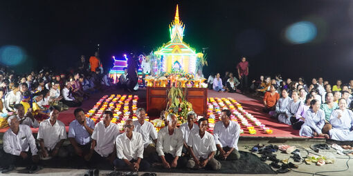 Từ chiều, khu vực khán đài sông Cái Lớn trở nên nhộn nhịp. Trên bến sông, những bàn lễ được bày trí trang trọng với hoa tươi, đèn, nến và các lễ vật đặc trưng: Cốm dẹp, chuối, dừa, khoai, bánh ngọt… gửi lòng thành kính của đồng bào Khmer dâng lên thần Mặt Trăng - vị thần được người dân tin rằng là thần phù hộ mùa màng bội thu, xóm làng bình yên, sung túc. Khi trăng tròn vành vạnh trên bầu trời trong vắt, tiếng nhạc ngũ âm, tiếng trống Chhday Dăm vang lên mở đầu buổi lễ. Những người cao tuổi là thành viên ban nghi lễ trong bộ áo trắng trang nghiêm tiến hành các nghi thức truyền thống như lễ bái tam bảo, cung thỉnh chư tăng tụng kinh chúc phúc, dâng hương cầu cho mưa thuận gió hòa, quốc thái dân an. Trong khoảnh khắc ấy, cả không gian như lắng lại, chỉ còn ánh trăng sáng dịu và những ngọn đèn soi bóng xuống dòng sông.