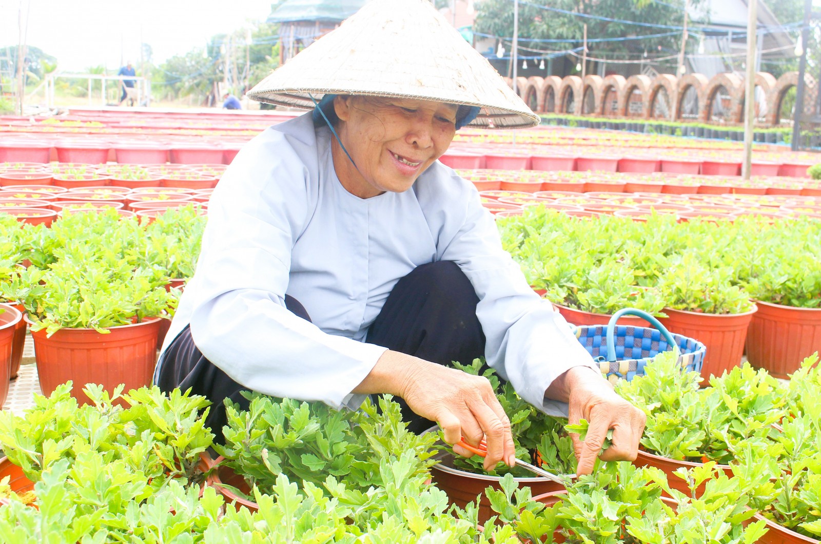Chúng tôi bước vào vườn ươm giống hoa cúc ở xã Nhơn Mỹ, không khí làm việc rộn ràng. Bà Nguyễn Thanh Giàu, 55 tuổi, vừa thoăn thoắt cắm hom giống vừa cười hiền: “Tôi ươm giống hoa tết từ tháng 8 âm lịch tới giờ. Bữa nào không làm ngoài ruộng thì tôi được thuê làm cỏ, xuống giống hoa”. Tuy phải phơi mình ngoài trời nhưng bà Giàu có thu nhập ổn định. Với tiền công 240.000 đồng/ngày, làm việc từ 6 giờ đến 14 giờ, bà có thêm khoản tích lũy đáng kể. “Chiều về tôi rảnh, có thể làm việc nhà hoặc phụ chăm cháu cho các con”, bà Giàu nói.
