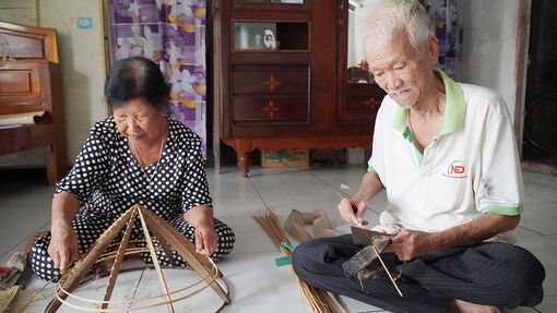 Cụ Phạm Thị Thang (74 tuổi), Tổ trưởng Tổ hợp tác chằm nón lá, cùng chồng là ông Phạm Văn Thu (76 tuổi) vẫn đều đặn làm nghề. Bà Thang chia sẻ: “Mỗi ngày vợ chồng tôi chằm được 2 chiếc nón đẹp, nếu nón thưa thì làm được nhiều hơn. Nay ít đơn hàng, nên tôi làm ít lại, nhưng nếu có đặt nhiều, tôi vẫn có thể làm kịp”.