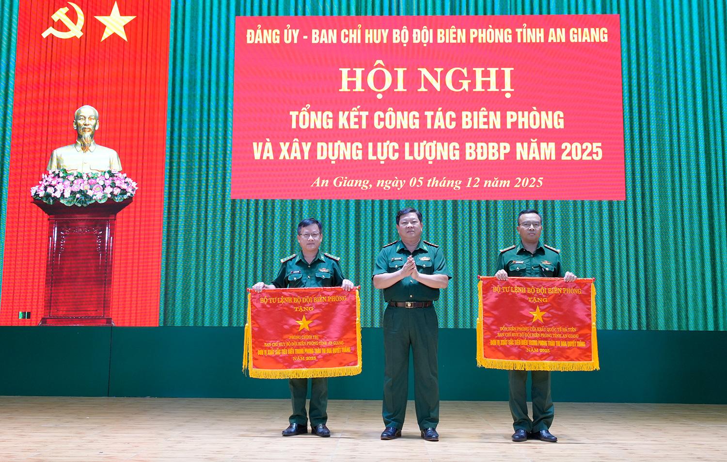 Đại tá Phạm Văn Thắng - Phó Chỉ huy trưởng Bộ Chỉ huy Quân sự tỉnh, Chỉ huy trưởng Ban Chỉ huy Bộ đội Biên phòng tỉnh trao cờ thi đua quyết thắng năm 2025 của Bộ Tư lệnh Bộ đội Biên phòng cho 2 tập thể. Ảnh: TIẾN VINH