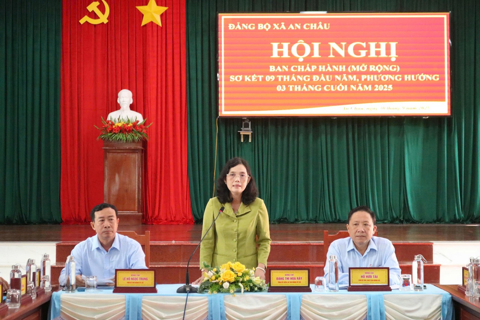Đảng ủy xã An Châu tổ chức Hội nghị Ban Chấp hành Đảng bộ xã lần thứ 2 (mở rộng), nhằm sơ kết tình hình thực hiện Nghị quyết 9 tháng đầu năm và đề ra phương hướng nhiệm vụ 3 tháng cuối năm 2025. Tỉnh ủy viên, Bí thư Đảng ủy, Chủ tịch HĐND xã An Châu Đặng Thị Hoa Rây chủ trì hội nghị.