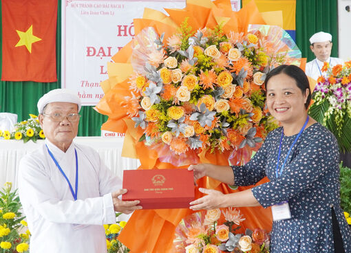 Phó Vụ trưởng Vụ Cao Đài Ban Tôn giáo Chính phủ, Bộ Dân tộc và Tôn giáo Nguyễn Thị Hương tặng hoa chúc mừng hội nghị.