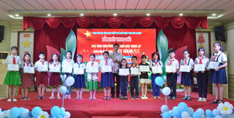 Ban tổ chức trao các giải A, B, C thi vẽ tranh thiếu nhi cho khối học sinh tiểu học.