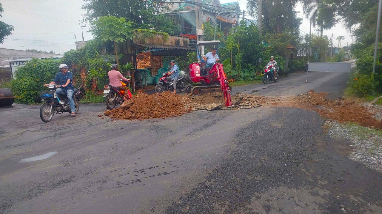 Đội thi công khẩn trương khắc phục sụt lún, đảm bảo giao thông tuyến đường không bị chia cắt, bảo vệ an toàn vườn cây ăn trái của bà con.