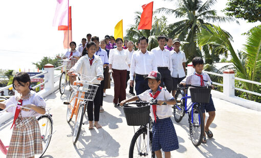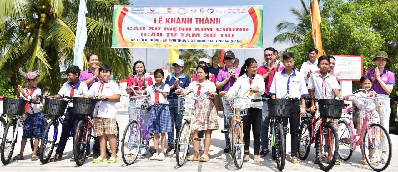 Học sinh xã Định Hòa được tặng xe đạp tại lễ khánh thành cầu Sứ Mệnh Kim Cương.