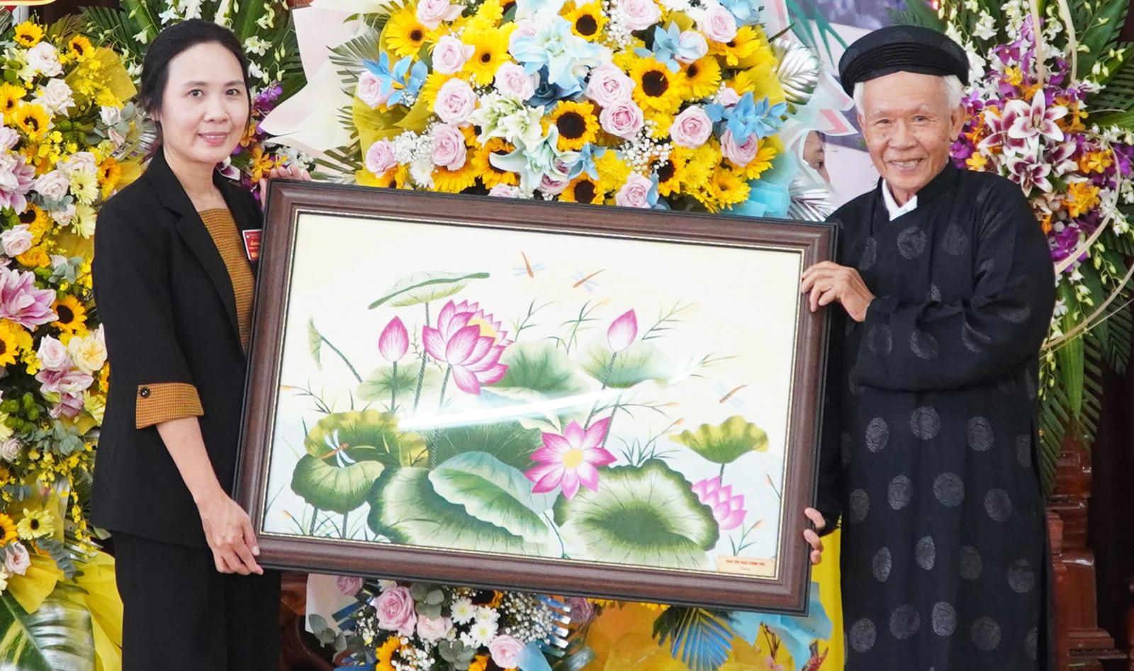 Phó Trưởng ban Tôn giáo Chính phủ, Bộ Dân tộc và Tôn giáo Trần Thị Minh Nga tặng hoa và quà chúc mừng.