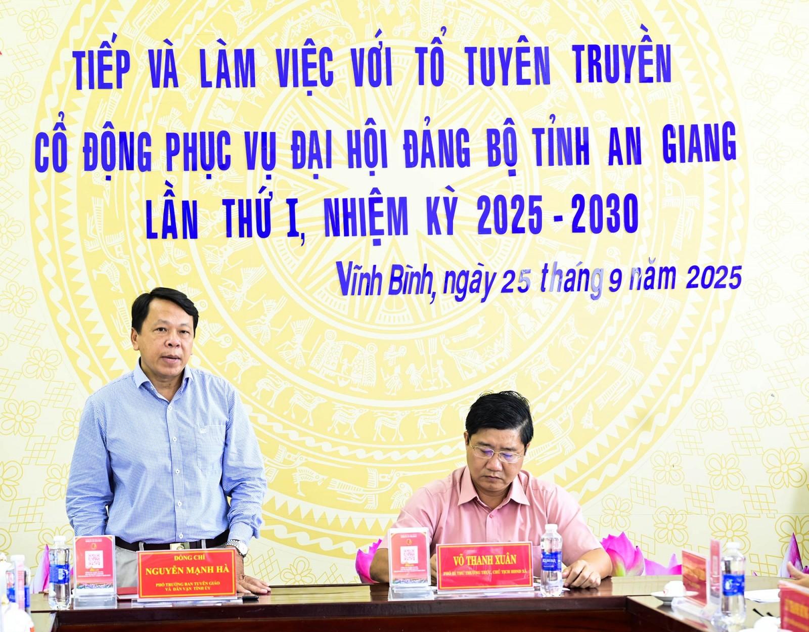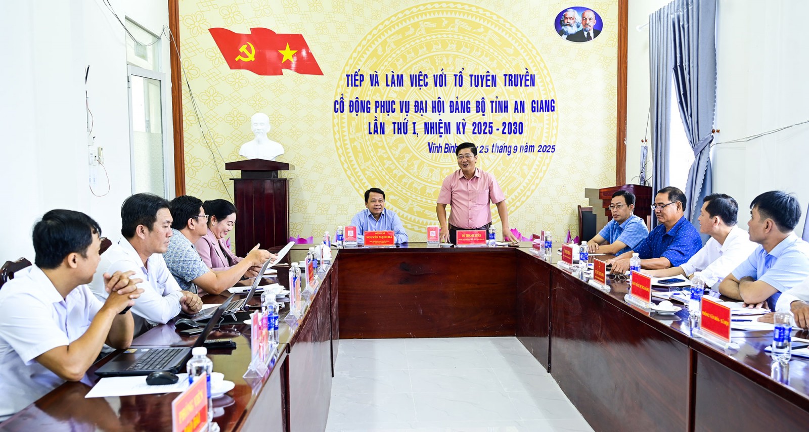 Chiều cùng ngày, Phó trưởng Ban Tuyên giáo Tỉnh ủy An Giang Nguyễn Mạnh Hà cùng tổ công tác tuyên truyền, cổ động phục vụ Đại hội đại biểu Đảng bộ tỉnh An Giang lần thứ I, nhiệm kỳ 2025 - 2030 có buổi làm việc với xã Vĩnh Bình.