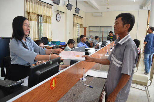 Công chức Trung tâm phục vụ hành chính công xã Kiên Lương trả kết quả thủ tục hành chính cho người dân.