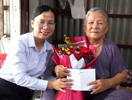 Bí thư Đảng ủy, Chủ tịch HĐND xã An Phú Quách Tố Giang dẫn đầu đoàn công tác của Đảng ủy, HĐND, UBND, UBMTTQVN xã đến thăm, chúc mừng Công an xã An Phú và đồng chí Trương Thị Lan (tự Hai A), nguyên Trưởng Công an xã Vĩnh Hội Đông cũ (giai đoạn trước năm 1975).
