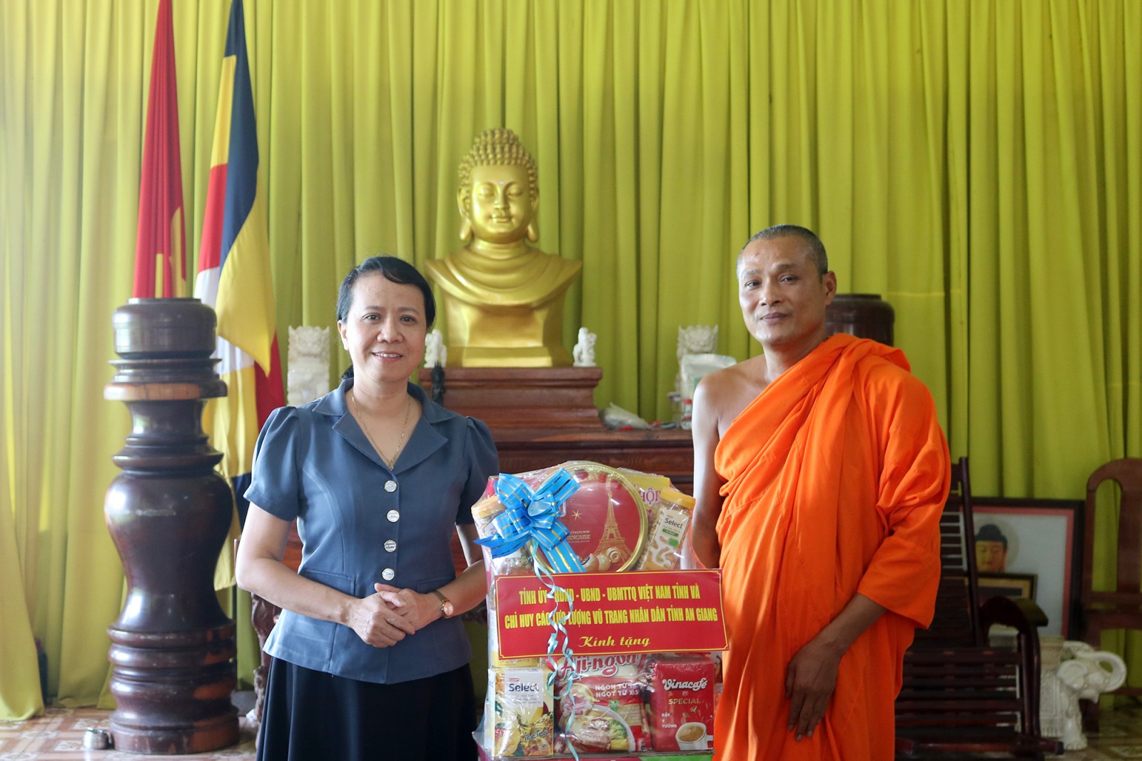 Cùng ngày, Phó Giám đốc Sở Dân tộc và Tôn giáo tỉnh An Giang Nguyễn Thị Phương Linh dẫn đầu đoàn công tác đến thăm, tặng quà chùa Press Tưng, xã Cần Đăng, nhân lễ Sene Đôn Ta của đồng bào Khmer.