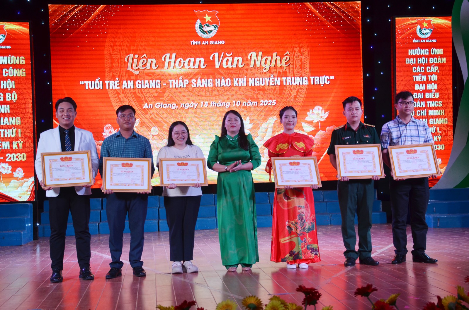 Phó Bí thư Thường trực Tỉnh đoàn An Giang Thị Phương Hồng trao bằng khen cho các đơn vị có thành tích xuất sắc tham gia Liên hoan văn nghệ với chủ đề "Tuổi trẻ An Giang - thắp sáng hào khí Nguyễn Trung Trực".