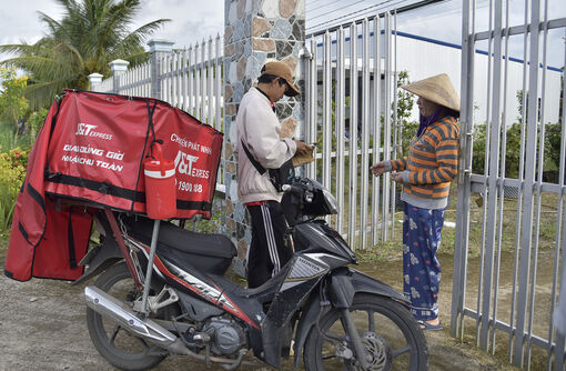 Nhân viên giao hàng cho khách ở xã Đông Thái. Ảnh: AN LÂM
