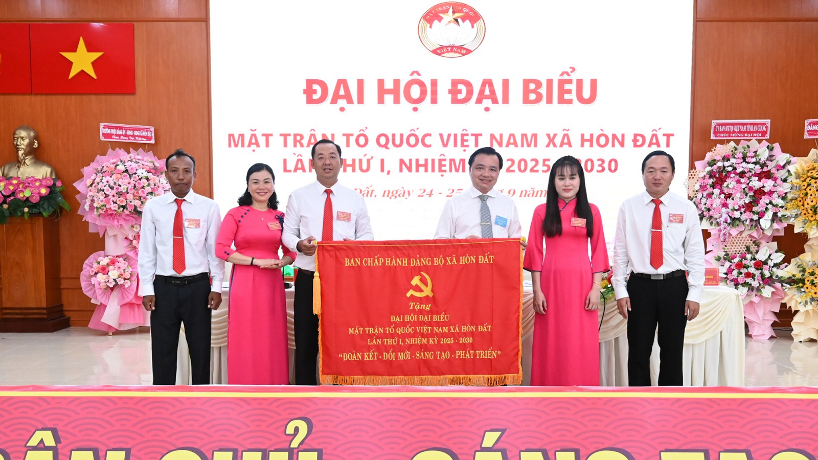 Bí thư Đảng ủy xã Hòn Đất Dương Minh Tâm (thứ ba, từ phải qua) tặng bức trướng cho đại hội.