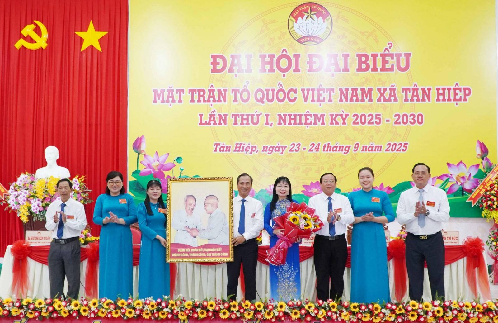Phó Bí thư Tỉnh ủy, Trưởng Đoàn đại biểu Quốc hội tỉnh, Chủ tịch Ủy ban MTTQ Việt Nam tỉnh An Giang Trần Thị Thanh Hương (thứ tư, từ phải qua) Ủy ban MTTQ Việt Nam xã Tân Hiệp bức tranh Bác Hồ - Bác Tôn, biểu tượng của tinh thần đại đoàn kết toàn dân tộc.