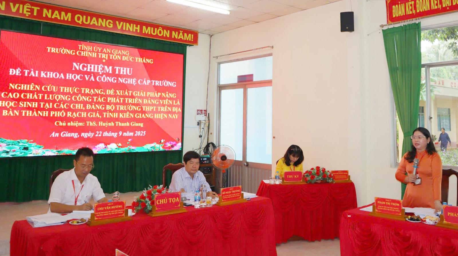 Ngày 22/9, Trường Chính trị Tôn Đức Thắng tổ chức Hội đồng tư vấn đánh giá, nghiệm thu đề tài khoa học và công nghệ cấp trường “Nghiên cứu thực trạng, đề xuất giải pháp nâng cao chất lượng công tác phát triển đảng viên là học sinh tại các chi, đảng bộ trường THPT trên địa bàn TP. Rạch Giá (tỉnh Kiên Giang) hiện nay” do ThS. Huỳnh Thanh Giang, giảng viên Khoa Xây dựng Đảng làm chủ nhiệm.