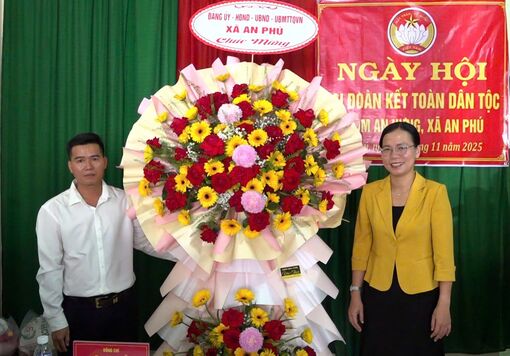 Bí thư Đảng ủy, Chủ tịch HĐND xã An Phú Quách Tố Giang tặng hoa chúc mừng.