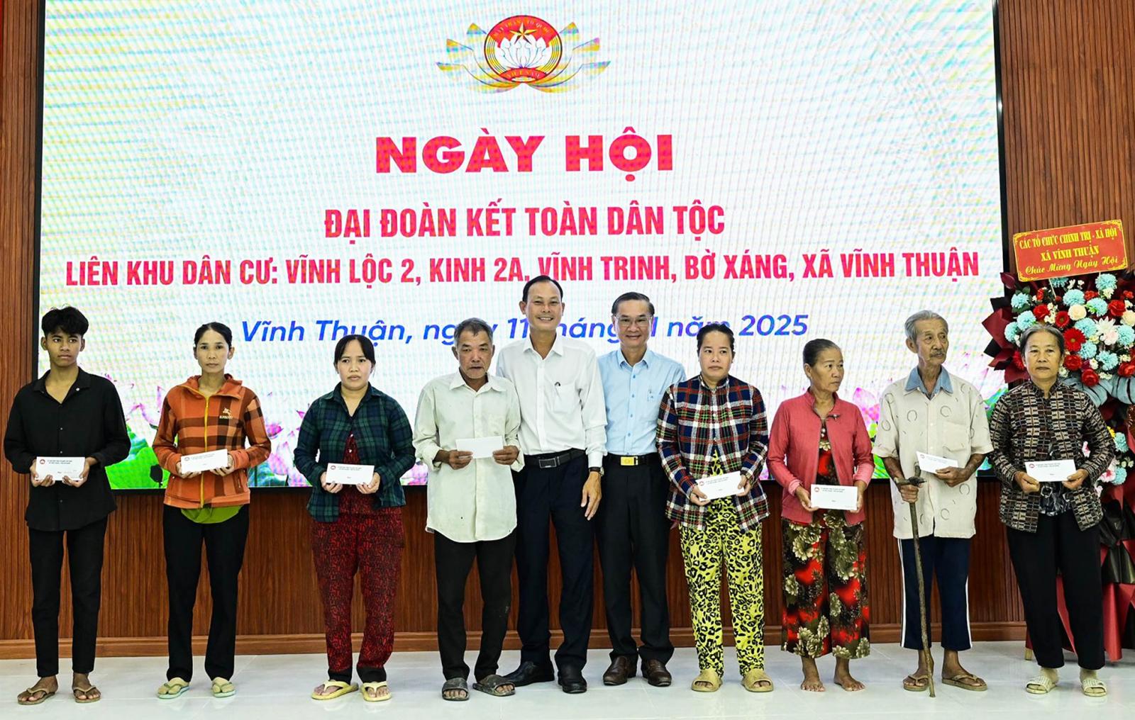Dịp này, Ủy ban MTTQ Việt Nam tỉnh An Giang tặng bằng khen cho 1 tập thể, 1 cá nhân có thành tích xuất sắc trong thực hiện cuộc vận động “Toàn dân đoàn kết xây dựng nông thôn mới”; UBND Vĩnh Thuận trao giấy biểu dương cho 15 cá nhân có thành tích xuất sắc trong phong trào thi đua yêu nước năm 2025. Nhân ngày hội, Ủy ban MTTQ Việt Nam tỉnh, Ủy ban MTTQ Việt Nam xã Vĩnh Thuận tặng 18 suất quà cho hộ nghèo, cận nghèo trên địa bàn xã.